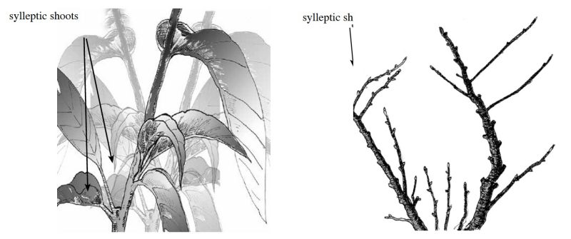 Sometimes axillary buds do not become dormant and develop into shoots within a few days of being formed. Such shoots are referred to as sylleptic shoots and are fairly common on vigorously growing peach trees, but are rarely produced on apple trees (Figure 6).