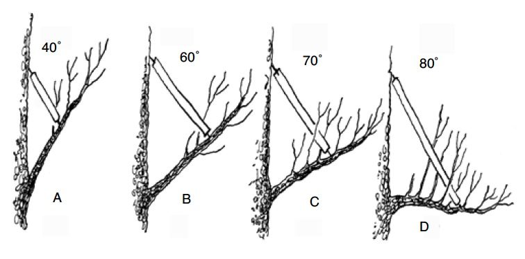 Another consequence of gravimorphism is the development of watersprouts from the upper surface of horizontally oriented limbs. Watersprouts are vertically growing shoots that develop from the upper surfaces of branches or near pruning cuts. High auxin concentrations on the underside of the limb inhibits growth of buds on the underside of the limb, but the concentration of auxin on the upper side of the limb is inadequate to inhibit bud growth and many of these buds develop into watersprouts. Watersprouts are usually undesirable and their development can be suppressed by orienting limbs no more than 45 degrees from the vertical. Fruit trees are sometimes trained as espalier (tree fence). There are several ways to espalier trees, but one method involves orienting limbs to a horizontal position. This system induces many watersprouts along the length of the branches. Watersprout development can be greatly suppressed by orienting limbs 45 to 60 degrees above horizontal (Figure 9).