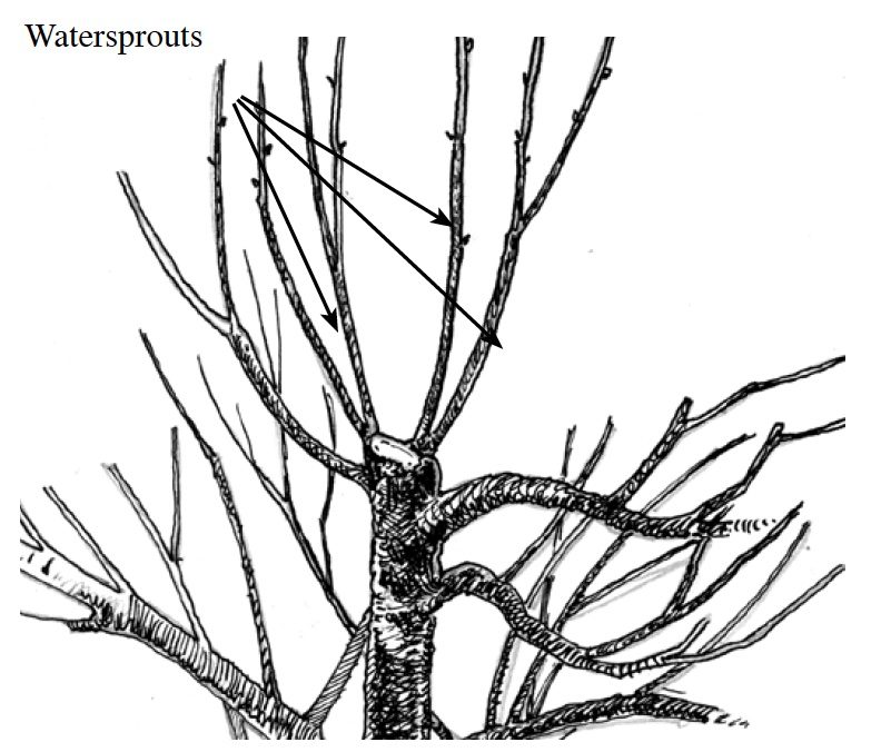 Reducing tree height by cutting into large diameter branches or trunks often results in the development of vigorous watersprouts around the cut. There are buds buried in the bark that normally remain dormant. However, a severe pruning cut will release these buds from dormancy.
